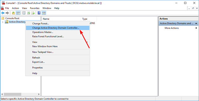 Right-click the Active Directory Domains and Trusts node and select “Change Active Directory Domain Controller”. Choose the domain controller that the Domain Naming Master FSMO role will be transferred to and click the “OK” button to bind the Active Directory Domains and Trusts snap-in to the target domain controller: