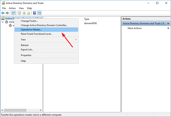 Right-click the Active Directory Domains and Trusts node again and select “Operations Master”: