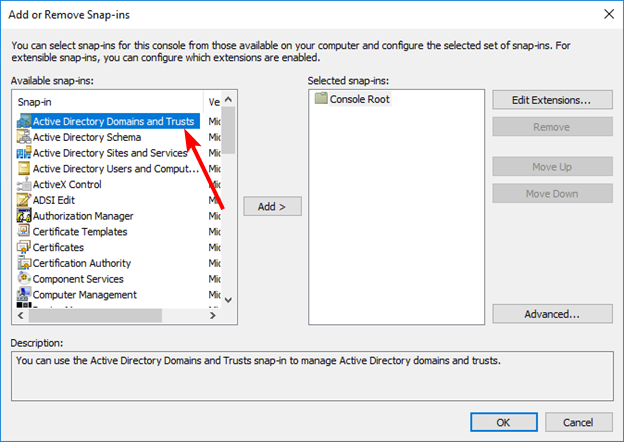 Run the Management Console as a user who is a member of the Enterprise Admins group and add the Active Directory Domains and Trusts snap-in to the Management Console:
