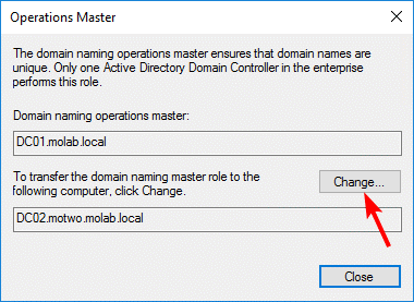 Click the “Change” button to begin the transfer of the Domain Naming Master role to the targeted domain controller: