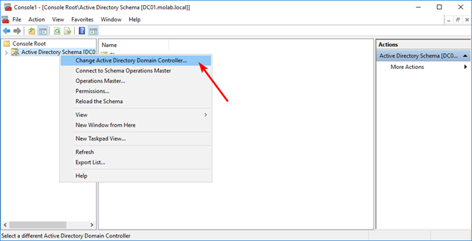 Right-click the Active Directory Schema node and select “Change Active Directory Domain Controller”. Choose the domain controller that the Schema Master FSMO role will be transferred to and click the “OK” button to bind the Active Directory Schema snap-in to the target domain controller (a warning may appear explaining that the snap-in will not be able to make changes to the schema because it is not connected to the Schema Master):