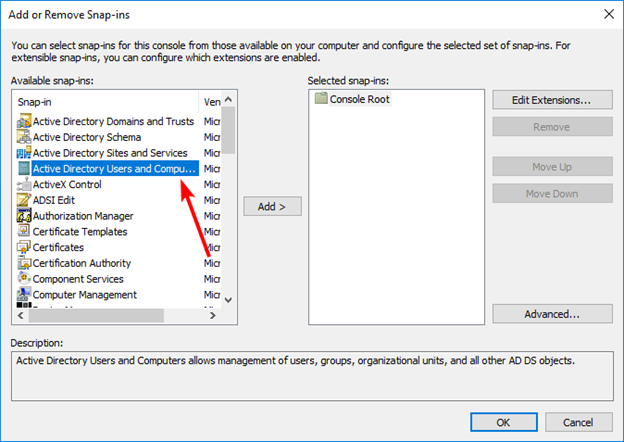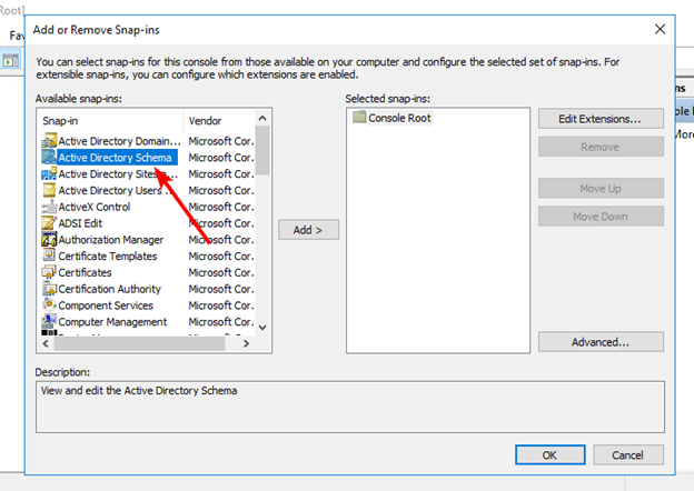 Once the DLL has been registered, run the Management Console as a user who is a member of the Schema Admins group and add the Active Directory Schema snap-in to the Management Console: