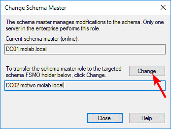 Click the “Change” button to begin the transfer of the Schema Master role to the targeted domain controller: