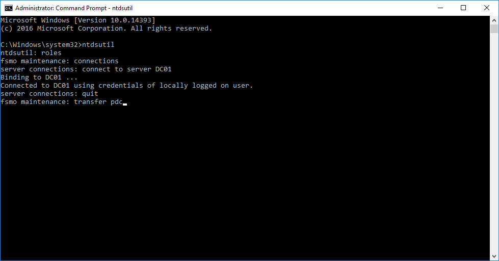 - To transfer the PDC Emulator FSMO role, type transfer pdc and press Enter.