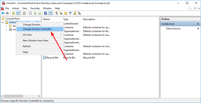 Right-click either the Domain node or the Active Directory Users and Computers node and select “Change Active Directory Domain Controller”. Choose the domain controller that the FSMO role will be transferred to and click the “OK” button to bind the Active Directory Users and Computers snap-in to the target domain controller: