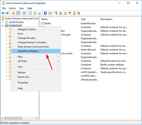 Right-click the Active Directory Users and Computers node and click “Operations Masters”: