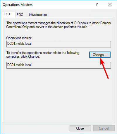 Select the appropriate tab and click the “Change” button to begin the transfer of the FSMO role to the targeted domain controller: