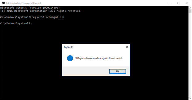 If the is not among the available Management Console snap-ins, it will need to be registered. To register the Active Directory Schema Management Console, open an elevated command prompt, type regsvr32 schmmgmt.dll, and press Enter: