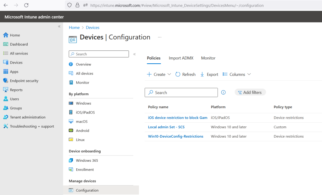 Navigate to intune -> Home->Devices->Manage Devices->configuration